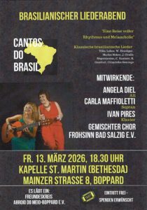 Der Konzertabend wird eröffnet vom gemischten Chor Frohsinn aus Bad Salzig. Im Anschluss daran werden Sängerinnen und ein Pianist Werke von brasilianischen Komponisten vortragen. In